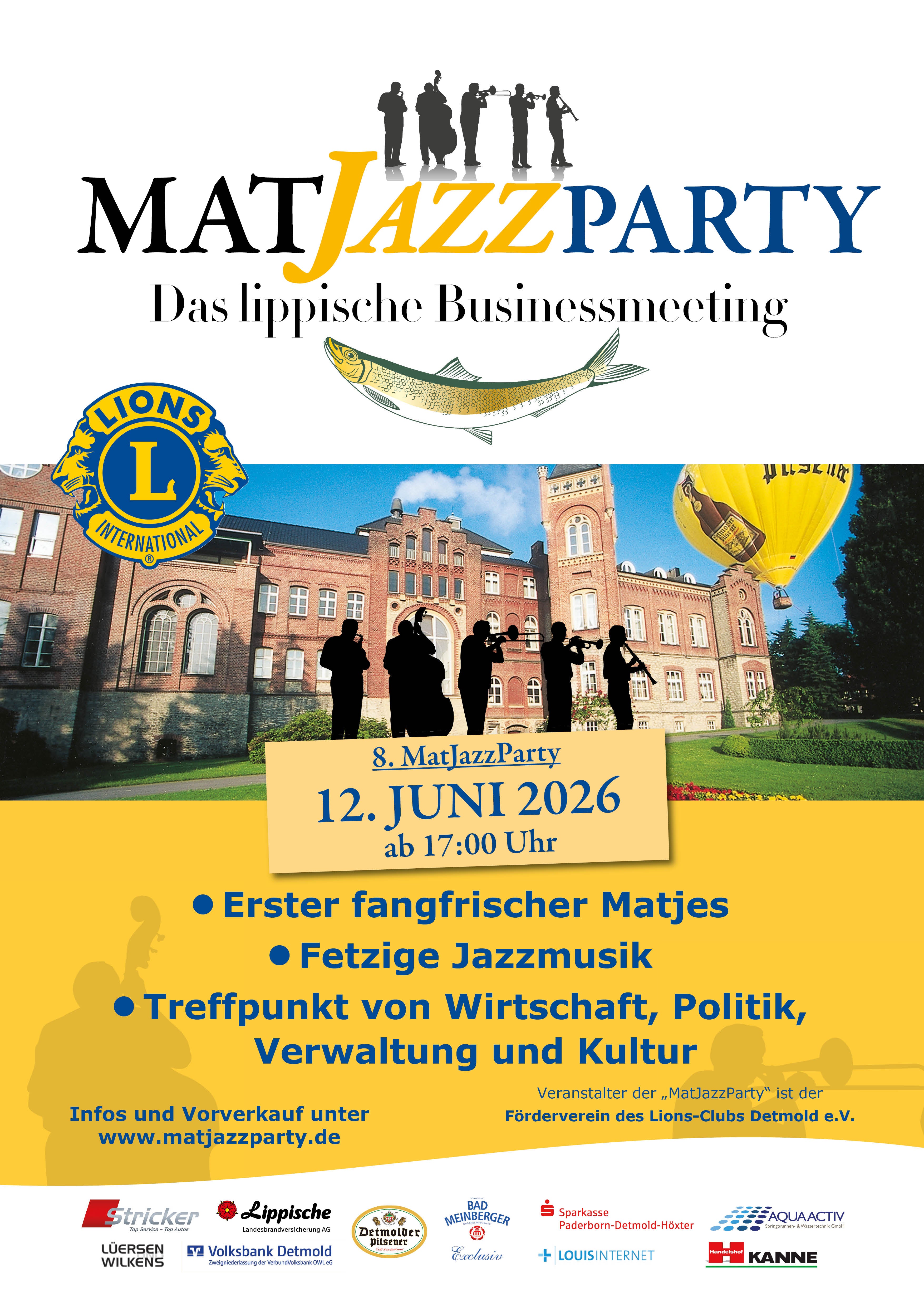 Der Gastgeber des Abends ist der Förderverein des Lions Club Detmold, der sich durch sein Engagement für soziale Projekte und die Gemeinschaft auszeichnet. Mit der MatJazzParty setzt der Verein ein Zeichen für Kultur und Zusammenhalt, während er gleichzeitig bedeutsame Initiativen in und um Detmold unterstützt. Ihre Teilnahme ehrt nicht nur die lebendige Jazzszene, sondern trägt auch dazu bei, dass der Lions Club seine wertvolle Arbeit fortsetzen kann.